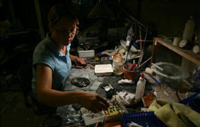 These days, Rusho fashions her glass into imaginative jewelry, functional ware and glass sculpture. Carefully stepping into the back room with small glass pieces crunching underfoot, Rusho offered a peek on her latest experiment with some 3-D pieces in her kiln. Cautiously she lifted the lid of her 900-degree-plus kiln showing off the partially fired pieces she was working on. It would take nearly six days to reach the 1,550 degrees needed to properly fuse the pieces. Rusho hates the waiting, but she has a shelf lined with bowls prematurely removed that serve as a reminder of the importance of waiting long enough and not peeking too often.