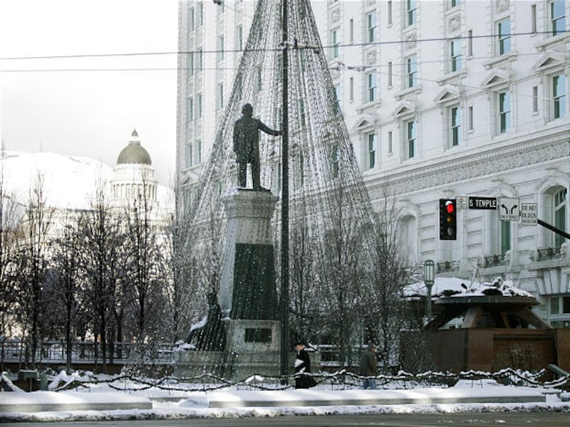 Seen in a photo from 1897, the building on the northeast corner of South Temple and Main streets in Salt Lake City was the second (and seventh) home of the Deseret News. The newspaper shared the building with a church store and post office from 1851 to 1854. Five relocations later, the Deseret News returned in 1862 and stayed until 1903. Today, the former Hotel Utah and current Joseph Smith Memorial Building, seen below in December 2007, stands in same spot.