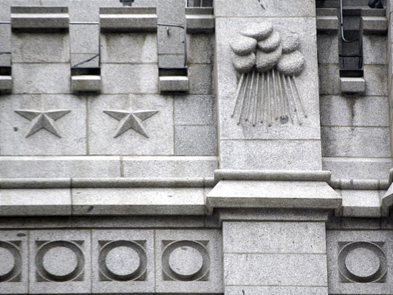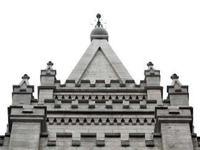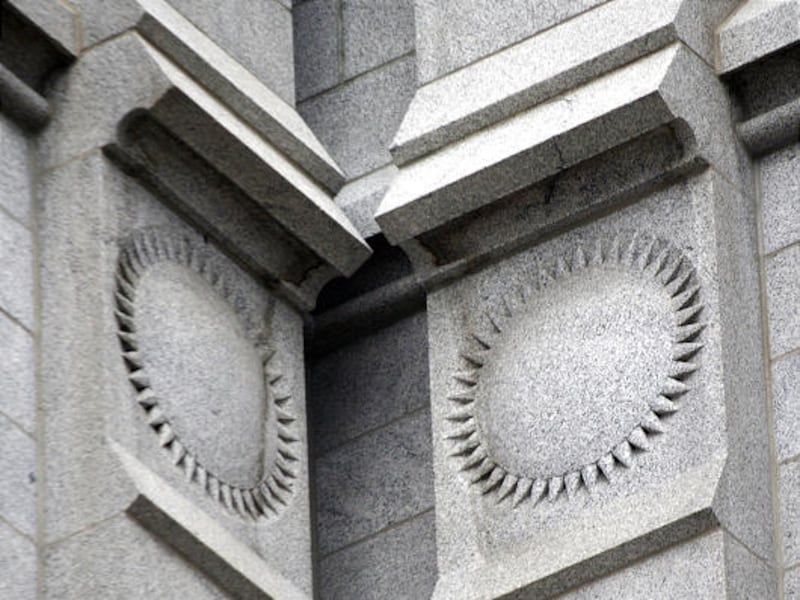 Eye — Above the upper windows in each of the center towers is a carved emblem, the "all-seeing eye."