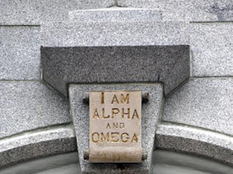 Near the windows of the east and west towers are keystones, inscribed with "I Am Alpha and Omega" (Revelation 22:13). This phrase represents time and eternity and is a proclamation of he who is without beginning or end.