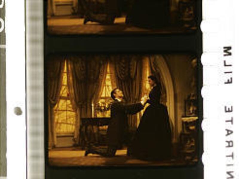 Gently unwinding the cyan negative of "Gone With the Wind" through her fingers — the Technicolor system required scenes to be recorded simultaneously in yellow, cyan and magenta — she pointed out an original splice in which Rhett — on his knees — proposes to Scarlett, whose second husband has just died.