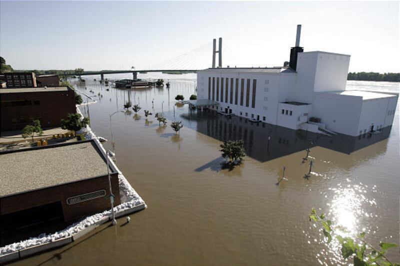 On the Iowa side of the river, a sandbagging operation was moved south to the outskirts of Burlington after floodwaters streamed across state Highway 99.