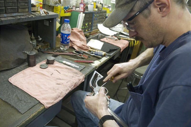 On a recent day, John Carey, a 14-year Freedom Arms employee, sat at a scarred workbench stoning the internal parts of a revolver. Expertly screwing the pieces together again, he repeatedly pulled the trigger with a special gauge to meet a customer's specifications.