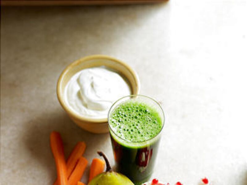 Every morning I drink about 8 ounces of what I call "green juice." I use a Breville juicer to make a blend of spinach, celery, cucumber, carrot and some fruit — pear, apple, pomegranate, plum, peach, a bit of orange peel and a small piece of ginger. The more of these ingredients that come from my organic garden, the better. I actually feel a jolt of energy when I imbibe these drinks.