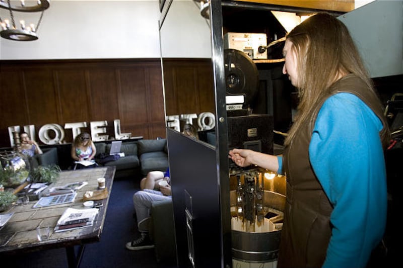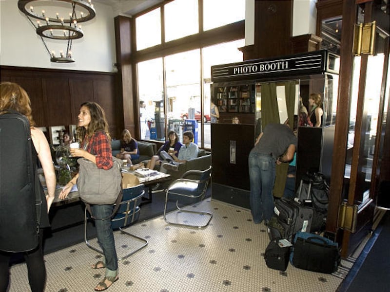 The front door of the Ace Hotel opens. A mom, her 2-year-old daughter and a baby sitter walk in. The child and sitter step inside the photo booth, and the light flashes through the curtains.