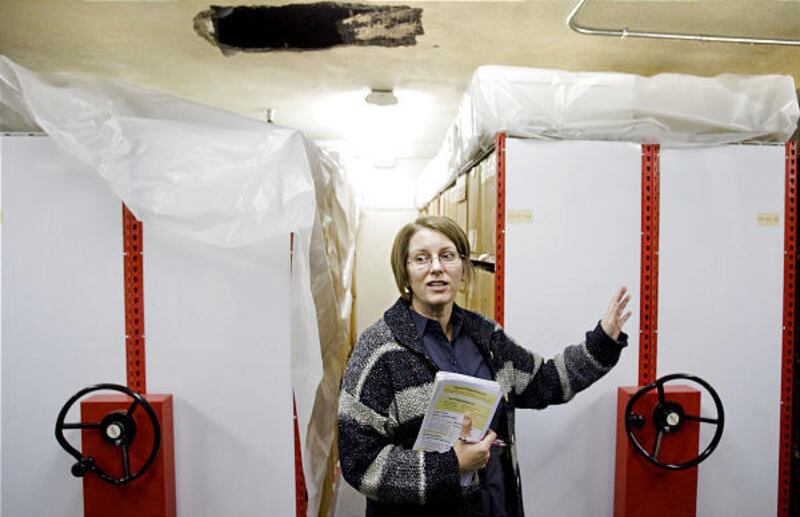 Haley Takoch, an evidence technician with the Salt Lake City Police Department, points to yellow stains on the ceiling and the plastic that covers the shelves filled with clues from the city's robberies, assaults and homicides.