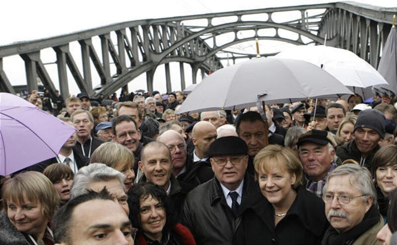 Chancellor Angela Merkel and 78-year-old Gorbachev stood shoulder to shoulder as they crossed a former fortified border crossing point between East and West Berlin to cheers of "Gorby! Gorby!"