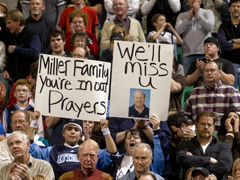 Prior to tipoff, the arena lights were dimmed except for two spotlights that glowed down from above onto the empty seat next to his mourning wife, Gail Miller.