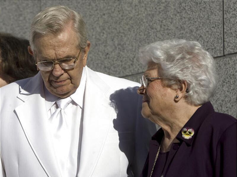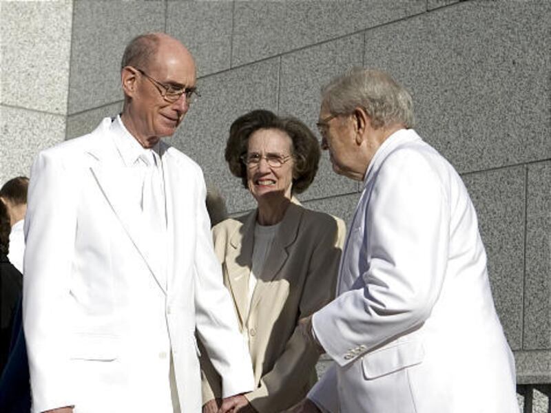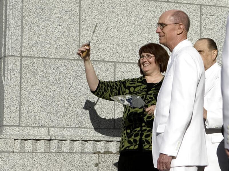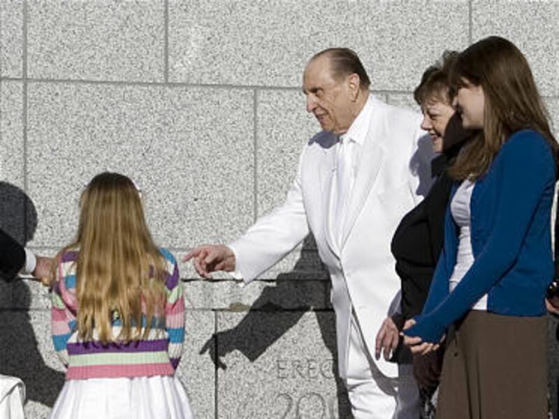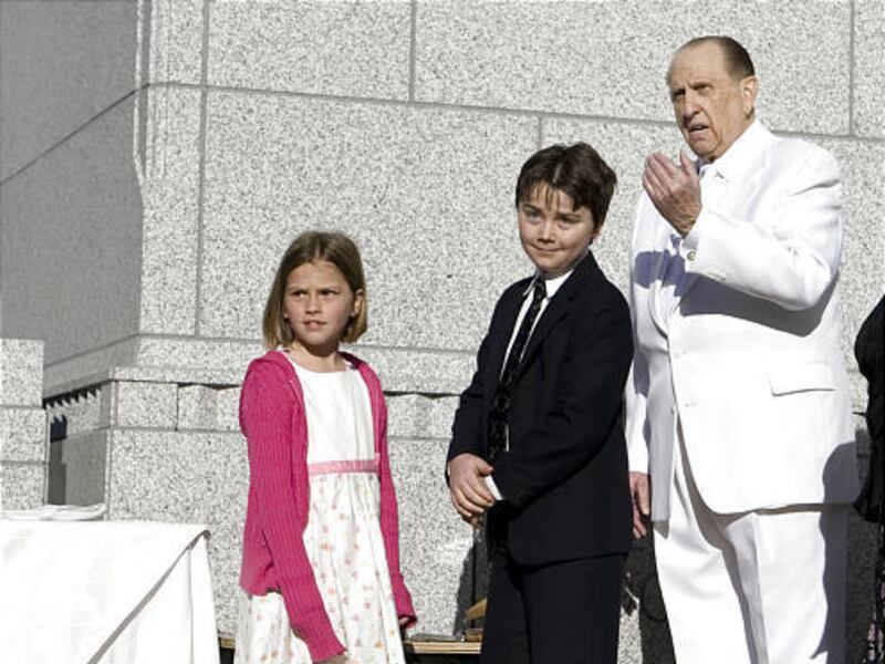 President Monson, considered a prophet by the 13 million members of The Church of Jesus Christ of Latter-day Saints, asked more than a dozen people to help him with the cornerstone ceremony before he dedicated the building in a ceremony inside the temple, which church members consider to be the holiest of the church's houses of worship.