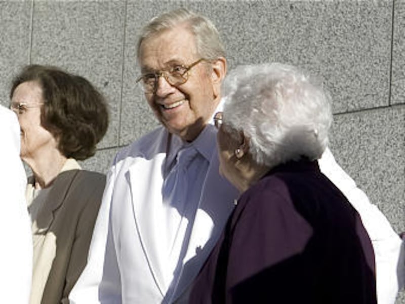 Later he asked his wife, Frances, his daughter, Ann, Church News Editor Gerry Avant, choir director Becky Alexander and others to take a turn at the cornerstone.