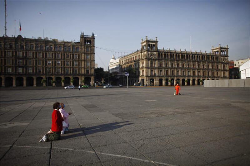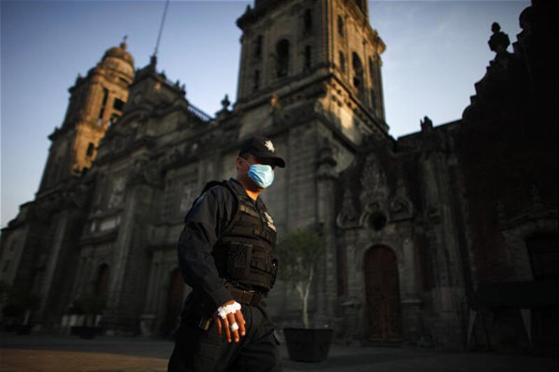 About a dozen federal police in blue surgical masks stood in front of Mexico City's Metropolitan Cathedral, which was nearly empty after a measure canceling services to avoid large concentrations of people.