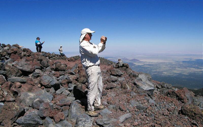 On top, there is a panoramic view that includes the distant Grand Canyon on a clear day. Many expanses containing volcanic cones are also readily visible. A circular pile of rocks has been built at the summit for a measure of protection against the usual winds there.