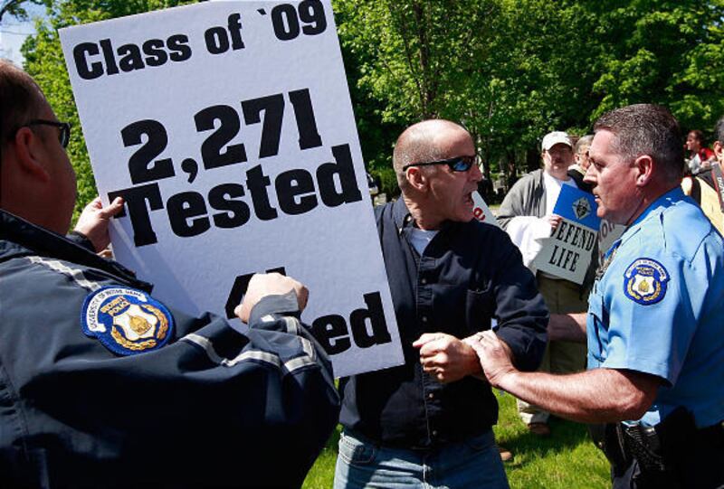 Some students who attended the rally carried signs declaring "Shame on Notre Dame" and "Stop Abortion Now." Many wore anti-abortion T-shirts, one of which depicted a leprechaun throwing a baby into a trash can and the words "May 17, 2009, The day the dome was forever tarnished," which referred to the school's famed golden dome.