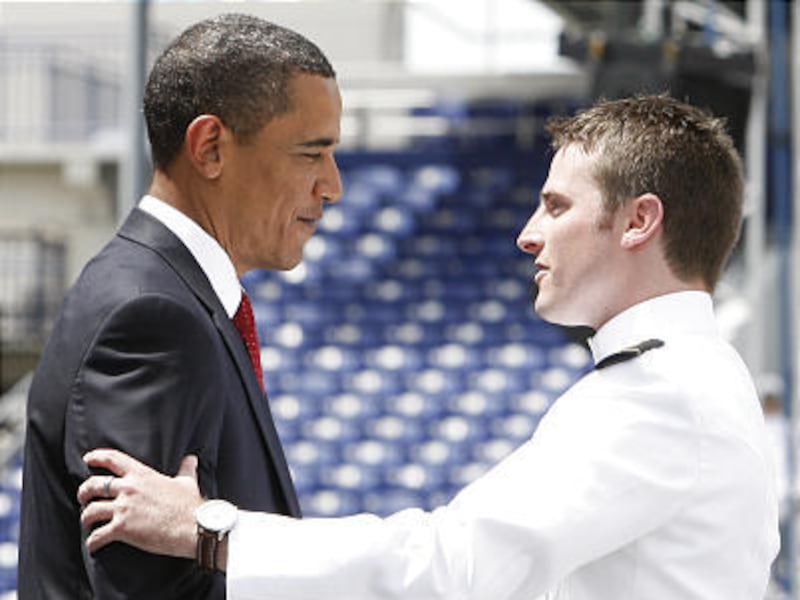 ANNAPOLIS, Md. — Far from the madding crowds of last year's campaign trail, Barack Obama quietly greeted the newly graduated midshipman and son of the man he defeated for the presidency.