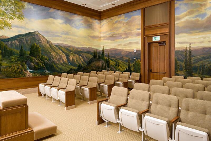 Endowment rooms. With seating for 48, the ordinance rooms are smaller than in most Utah temples. The endowment instruction will occur in a two-room sequence. The A rooms have murals and not much room to spare beyond the seating. The B rooms are lighter and roomier.