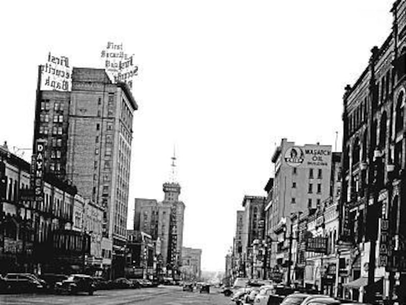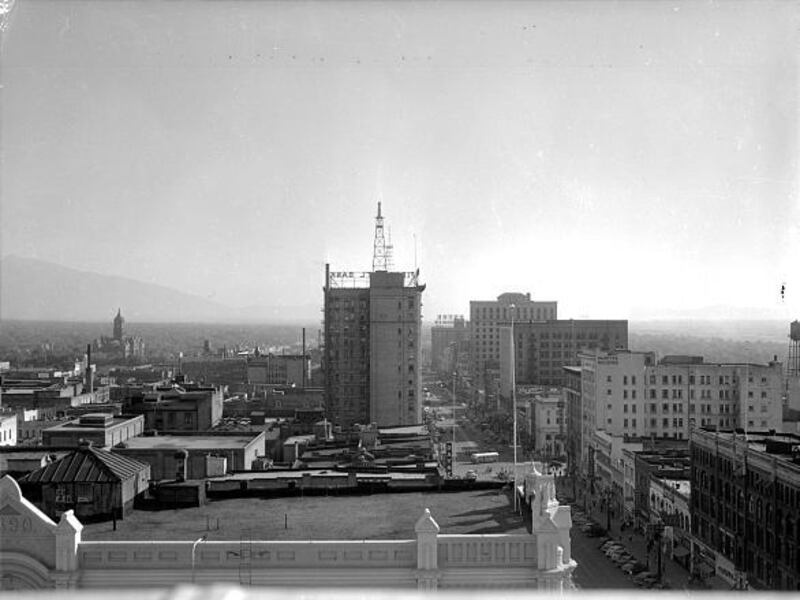 A 1930 photo of a multi-story Deseret News building shows a trolley running along rails down the middle of the street. At the time, trolleys were being phased out in favor of gas-powered buses, and a 1949 photo shows a Main Street free of rail lines and diagonally parked cars lining the street.