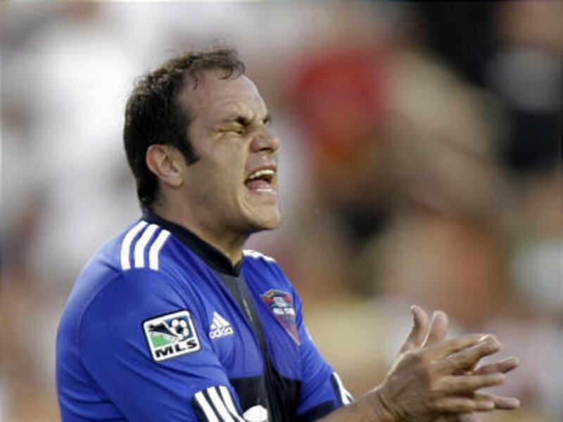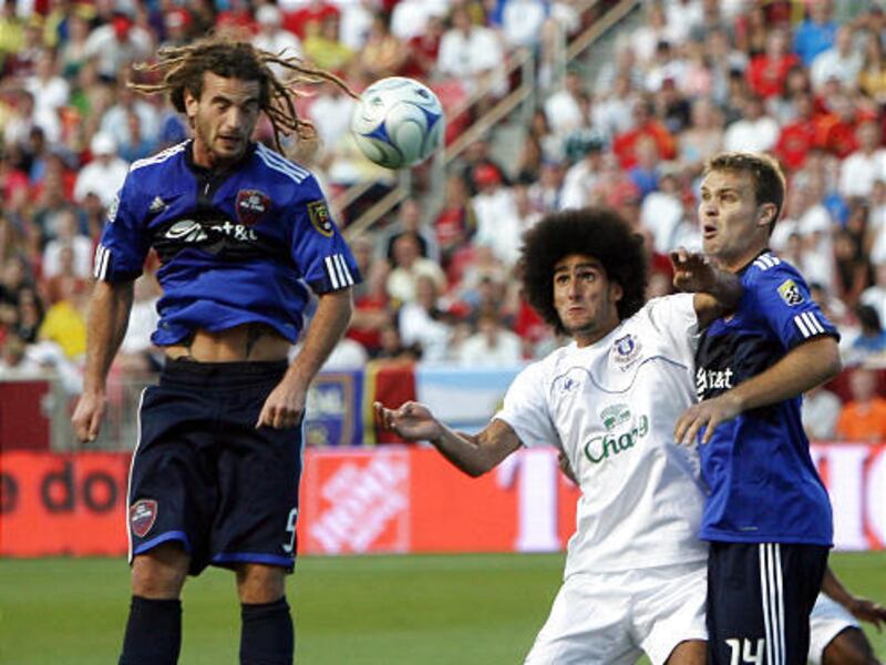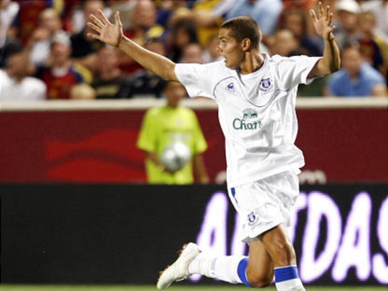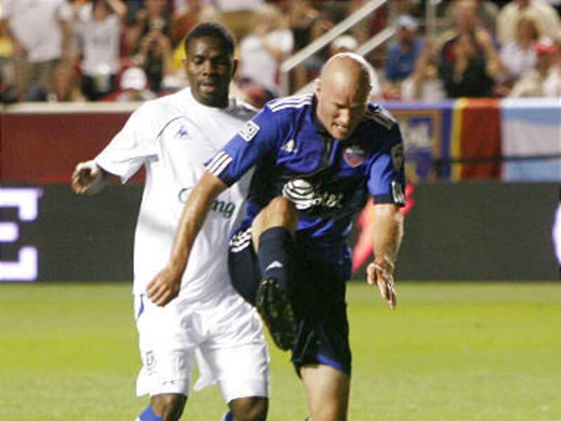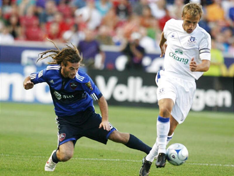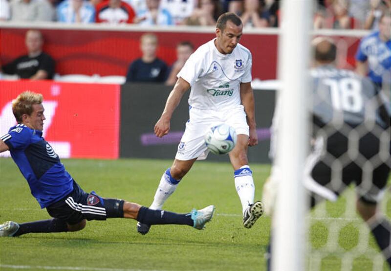 Houston midfielder Stuart Holden gifted Everton its first goal in the 12th minute. Upon receiving a throw-in near the top of his own box, Holden tried playing a simple ball across the top of the 18-yard box to teammate Chad Marshall. Everton striker Louis Saha must've been in Holden's blind spot. The Houston midfielder passed the ball directly to Saha who quickly turned and buried the shot past help MLS keeper Kasey Keller.