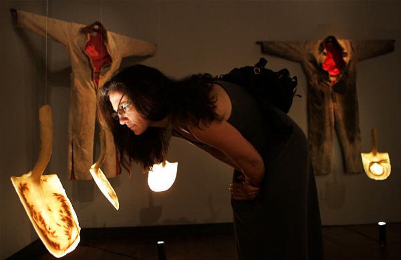The piece by Scott Grieger is likely the exhibit's bluntest piece. The large black-and-white painting has a text, "United States of Anxiety," painted largely across the country.