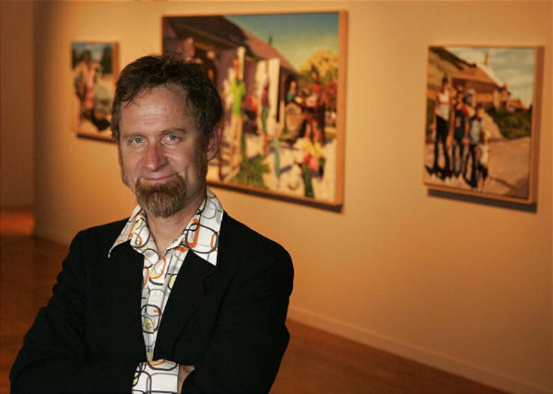 His painting, "Cocktail Party," features, as he called it, a farm with a serious peacock problem.
