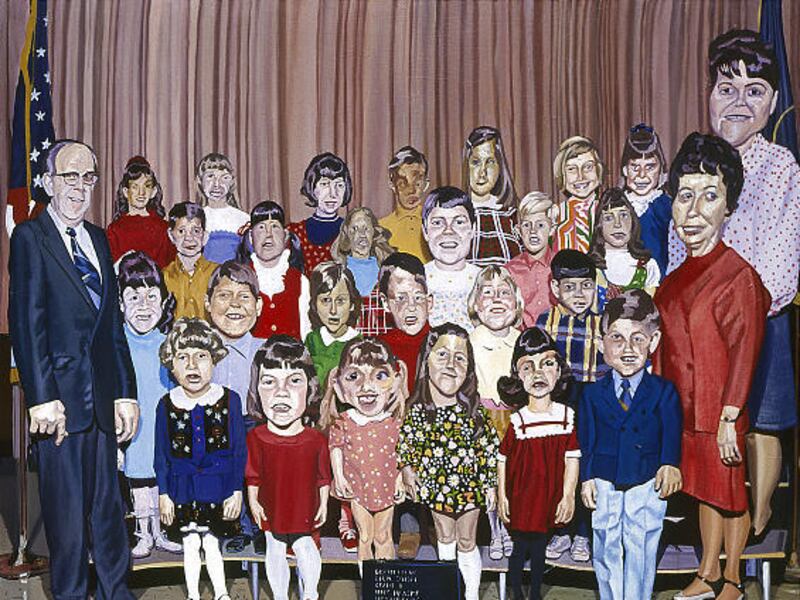 Each of his four pieces is a skewed painting, making a statement about nostalgia and familiar scenes, such as the class portrait in "Cheese."