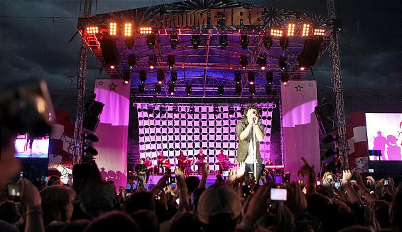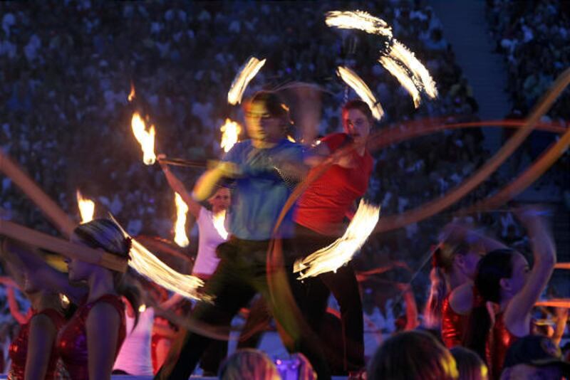 Moments later, the stadium truly became the stadium of "fire" as a fire show erupted, complete with columns of flames and dancers twirling fiery batons and hoops.