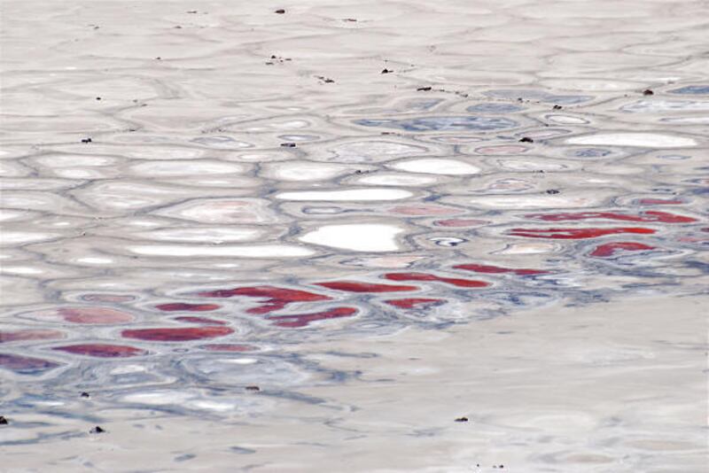 Purple-blue water lapped at the jetty's southern border. A shallow, flamingo-pink broth pooled within some of the coils. And even more of the "Monet pads" to the west had water in them, some colored a deep blood-rose or burgundy.