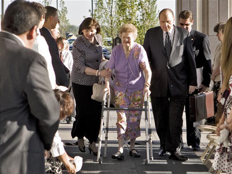 Sister Frances Monson, President Monson's wife, attended the dedication but remained inside during the cornerstone ceremony.
