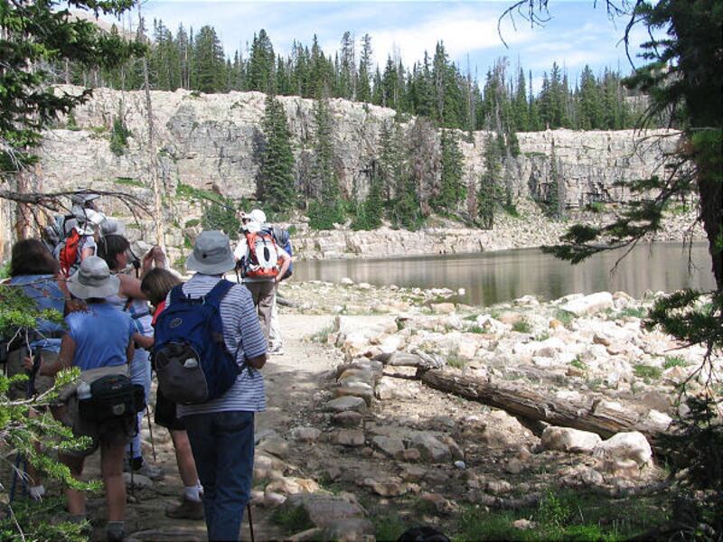 From Crystal Lake Trailhead, take the Notch Mountain Trail to Wall Lake. This trail is next to the horse ramp in the parking area. The trail heads north and goes between the Lily Lakes, on the way to Wall Lake. At 1 mile you arrive at the largest lake, Wall Lake. From Wall Lake the Notch Mountains are to the north. The depression in the mountains is called, The Notch. The trail passes by a few unnamed lakes and switchbacks a cliff face to Hope Lake, at 2 miles. At 2.9 miles you arrive at The Notch. As soon as you arrive, go left on the mountain shelf and watch for cairns taking you down to Clyde Lake. Looking west from the shelf is Clyde Lake and Mount Watson. Looking below the shelf to the south is Twin Lakes. At 3.9 miles you arrive on the north side of Clyde Lake and the trail continues west along its bank. Clyde Lake is a great place to take a lunch break before you continue the hike. After Clyde Lake the trail turns south for Watson, Linear, Petite and Cliff lakes. At Cliff Lake look for rock climbers on the cliffs. The trail arrives at the Lakes Country Trail junction. At the junction, go left to complete the loop. This has to be one of the most beautiful hikes in the Uintas. Hike slowly and take in the beauty!