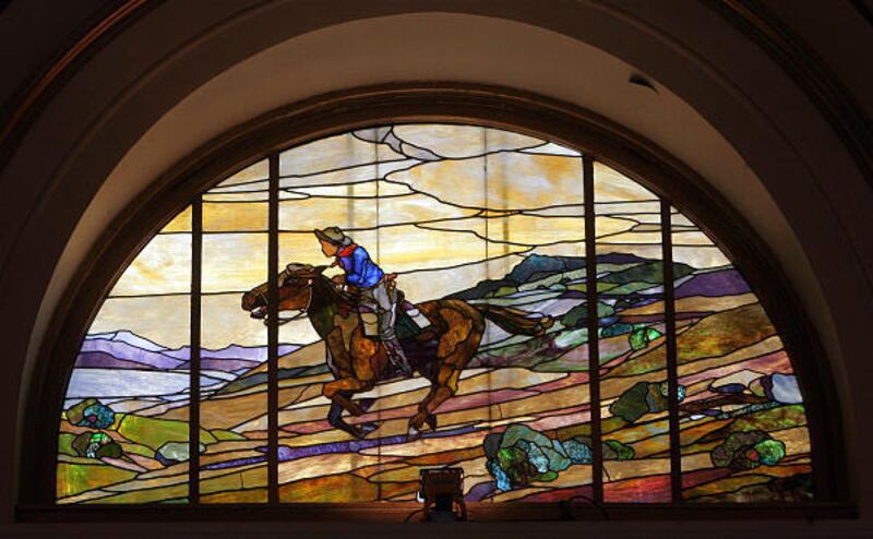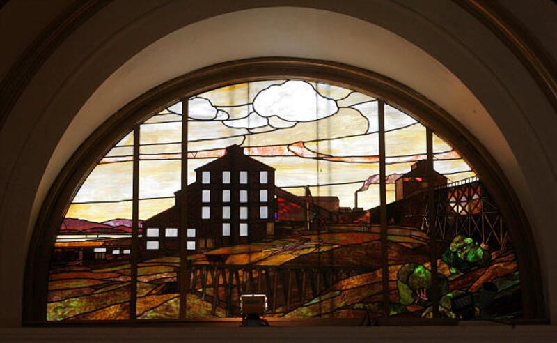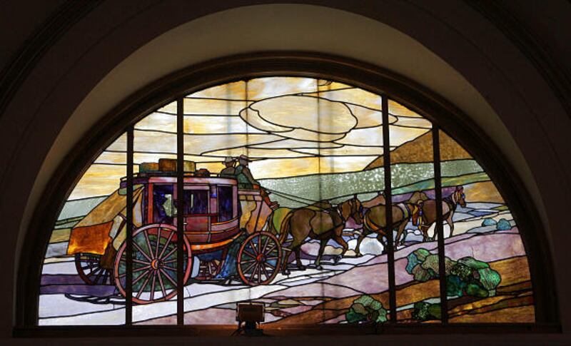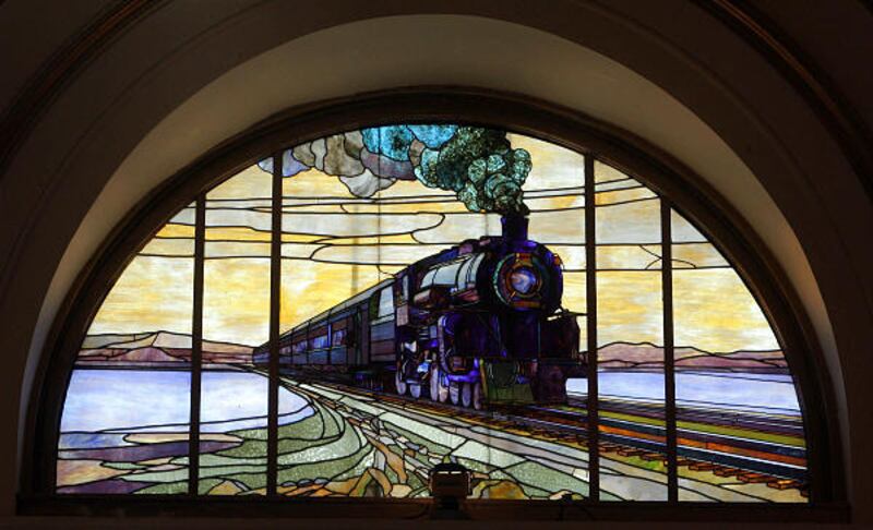 The west wall of the waiting room, which overlooked the tracks, had five stained-glass windows done by another San Francisco artist, Harry Hopp, showing mountains, trestles, agricultural scenes and forms of transportation.