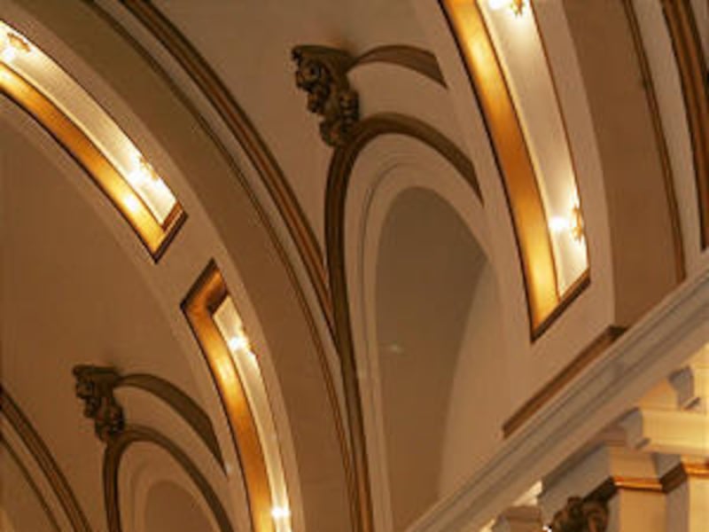 "Each arch is illuminated by 18 incandescents, and a row of closely spaced lights runs all around the room."