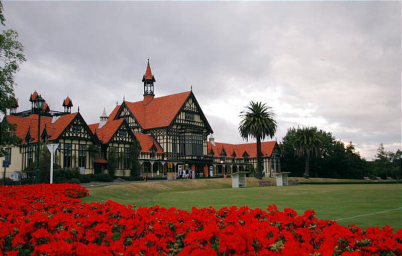 Government Gardens in urban Rotorua, beside Lake Rotorua, is stately and lovely, with a rose garden, of course; antique bathhouses employing the area's sulfuric thermal springs; and well-kept lawns (including a bowling green) and flowerbeds.