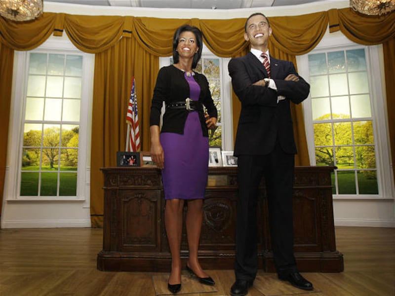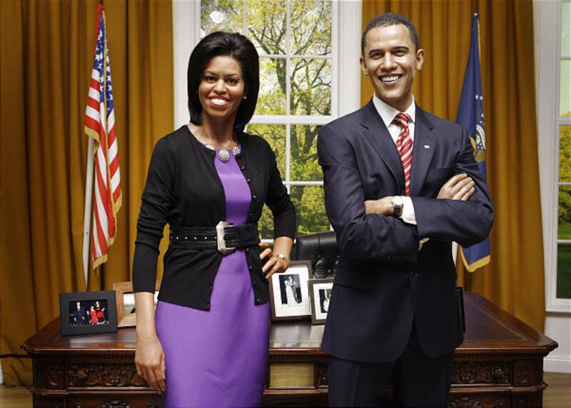 The figure of the stylish first lady wearing a sleeveless purple dress and black sweater has been placed next to one of her husband in a recreation of the Oval Office.