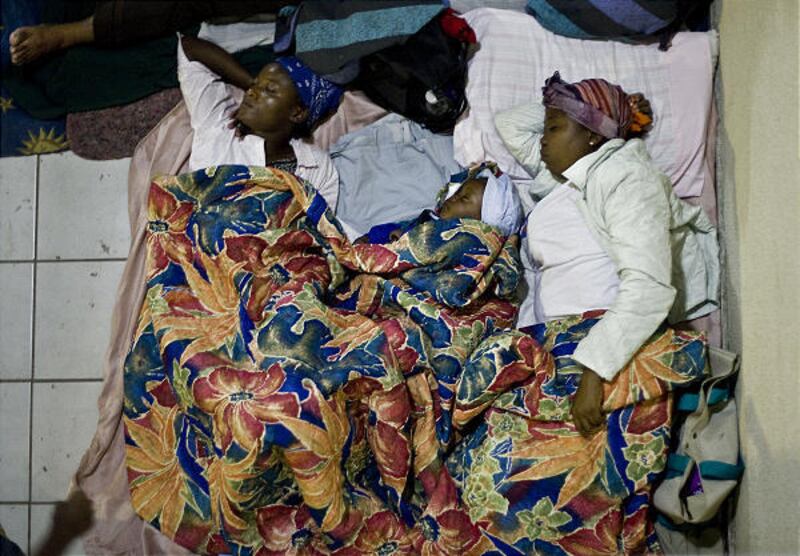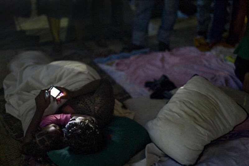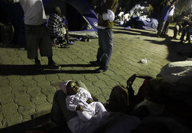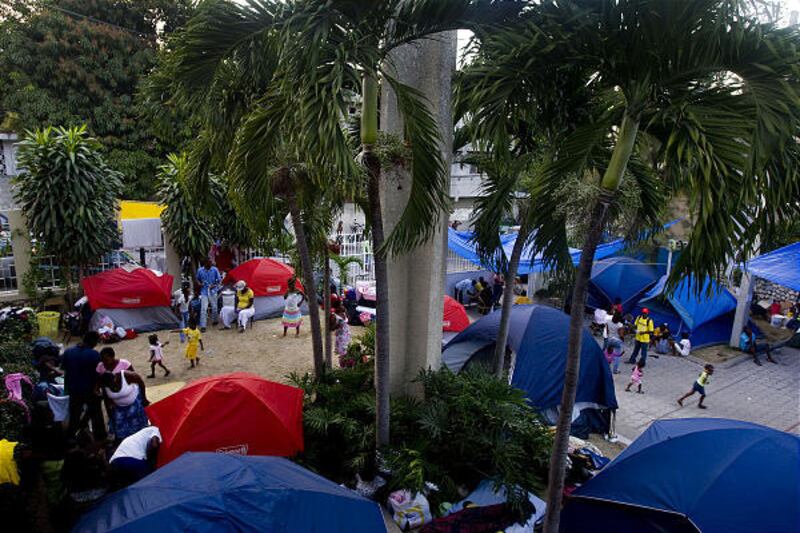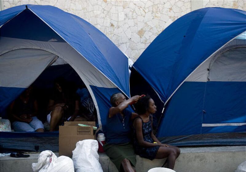 People drifted to sleep Wednesday night in tents, under palm trees and on the concrete courtyard. Mattresses covered nearly every inch of open space, causing anyone moving about to tiptoe.