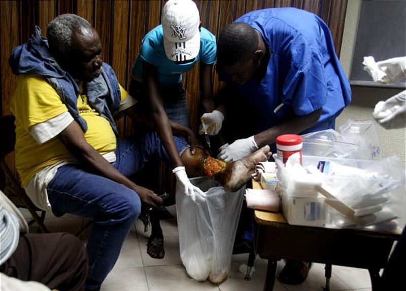 Clad in blue scrubs, he opened his "clinic" in a church classroom Wednesday night and with two "nurses" cleaned and redressed leg wounds on two elderly men.
