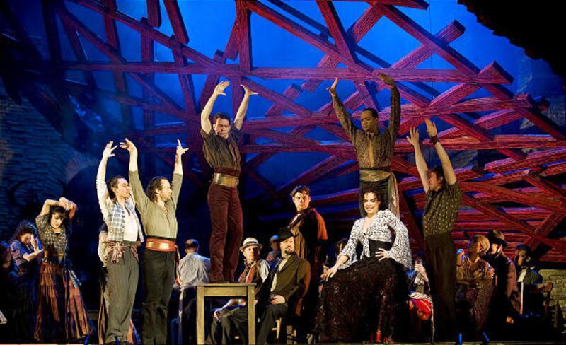In fact, the first image we see in a striking new production by Richard Eyre that premiered on New Year's Eve is a jagged red streak running down the middle of a black curtain. That disturbing image carries over into a narrow opening between sliding panels that move to reveal the sets. And it shows up again on the elegant dress Carmen wears in the final scene.