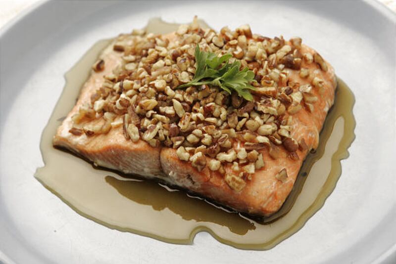 Lightly brush grill with oil, and begin preheating it. When grill is hot, place the 2 salmon fillets on it. Sprinkle a little salt and pepper to taste, and close the lid. Cook for 3 minutes. Lift the lid and quickly sprinkle pecans across the top of each filet, until they are well-covered. Set the grill lid down and finish cooking for 1 more minute, or until flesh looks opaque, flakes easily with a fork, or is 135-140 degrees with a meat thermometer (temperature will continue to rise slightly after removal from grill). Before serving, drizzle maple syrup over the salmon. Serves 2. — Valerie Phillips