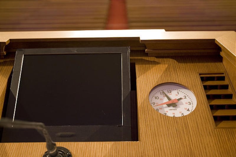 Even when it's not in use, the pulpit remains essentially at the same location, just dropped a dozen feet below the rostrum on the same vertical footprint. It sits on a motorized pylon — one that not only adjusts the pulpit to preset measurements of the speakers' respective heights but also lowers it into permanent storage underneath the main staging area.