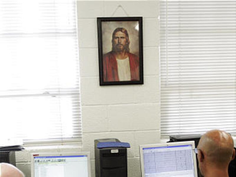 When the announcement is made over the loudspeaker, 90 or so inmates who have been properly cleared walk a quarter mile and line up at the door to the prison chapel. They are greeted by reverent organ music.