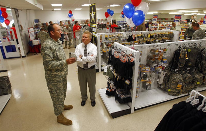 Major General Brian L. Tarbet, left, talks with Steven C. Collier, general manager of Utah Exchange, as they walk around the newly reopened troop store at Camp Williams. A short ceremony was held to celebrate.