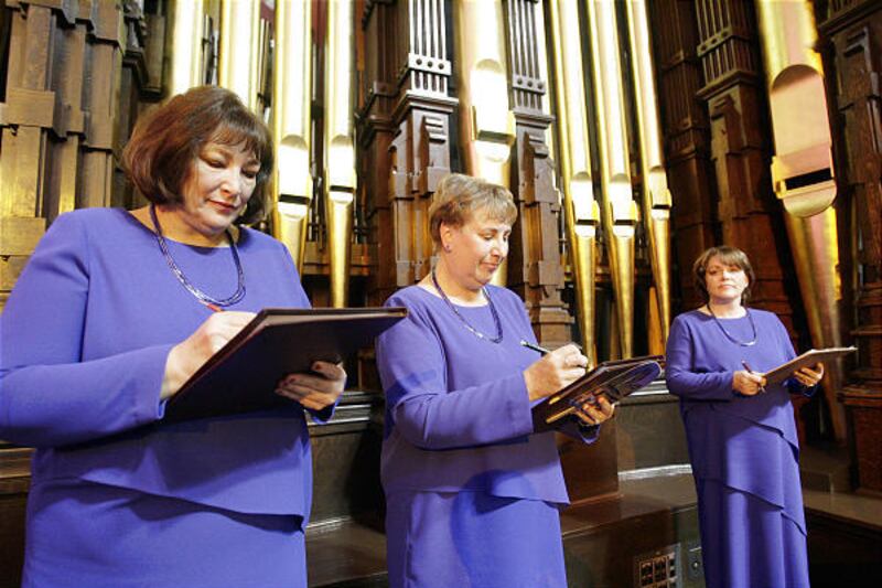 For the women, that means one of about eight different dresses. Each singer is assigned a number, by section. That's the number used for their closet, for their dresses. "Here, they lose their name and get a number," jokes Peggy Becker, a master seamstresses.