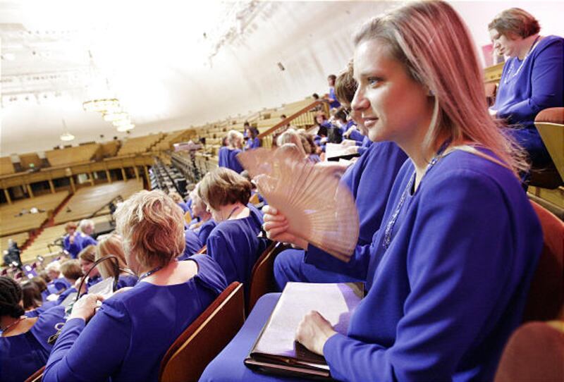 At around 7:45, members of the 110-person, all-volunteer orchestra begin to arrive. "It's an amazing experience," woodwind expert Daron Bradford says, "to sit in front of this great choir, to be involved with something this superb." It is different, he says, from any paid orchestra he has been part of. "The purpose here is much higher."