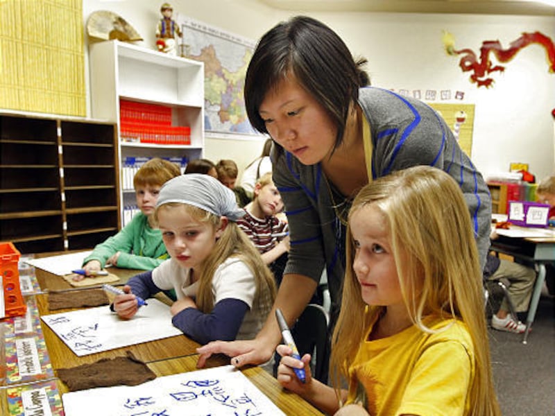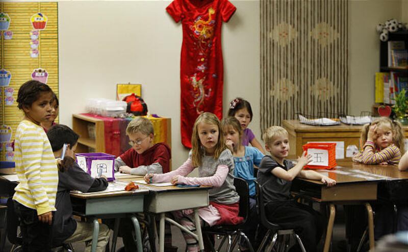 The 50 kids in the Chinese immersion program at the school spend half their day learning math, social studies and science in Chinese and the other half learning language arts in English.