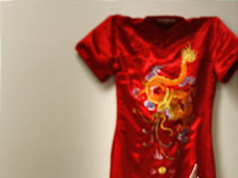 The door is draped in a Chinese flag and Chinese symbols are scattered across the walls under shapes, numbers, pictures of animals and around the clock.