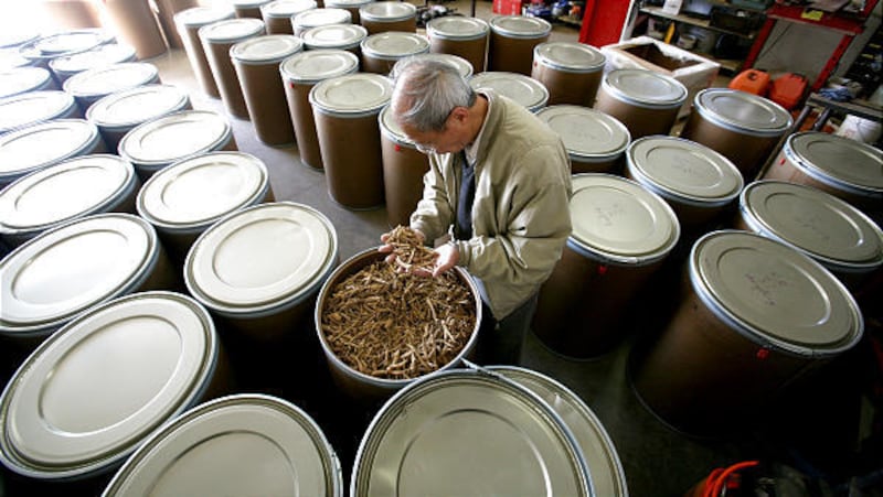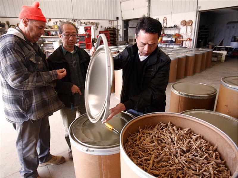 MARATHON COUNTY, Wis. — Two Asian buyers with screwdrivers pop lids off brown barrels brimming with valuable ginseng roots, and grower Joe Courchaine names his price: $44 a pound.