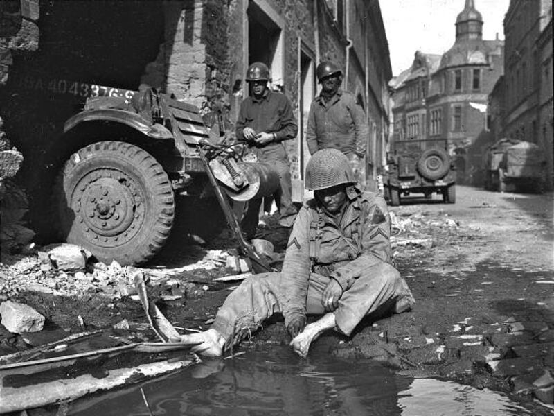 He remembers another photo that got a lot of attention. "A hard day of fighting was over, and this soldier came back, and there was a puddle of water in the street. It had been raining. And his feet were killing him. He just took his shoes off and washed his feet and got some comfort, and I just came along and happened to see it."