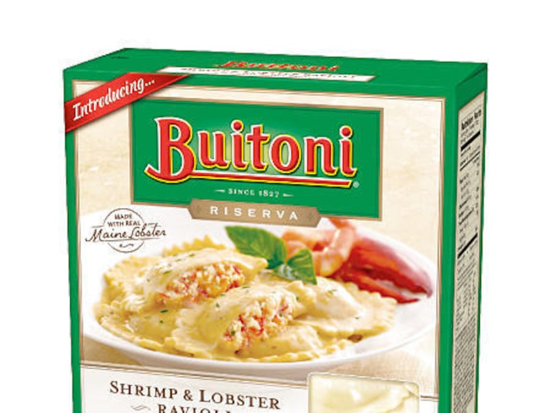 Buitoni Riserva Complete Frozen Meal for Two. Four Cheese & Spinach Ravioli With Tomato Basil Sauce, Five Cheese Cannelloni With Tomato Basil Sauce, Braised Beef & Sausage Ravioli With Creamy Marinara Sauce, Chicken & Mushroom Ravioli With Marsala Wine Sauce, Grilled Chicken & Spinach Cannelloni With Alfredo Sauce, Shrimp & Lobster Ravioli With Garlic Butter Sauce, and Southern Italian Style Meat Lasagna. $8.99 to $9.99 per 22- to 26-ounce box.