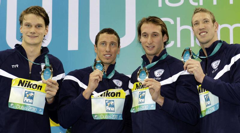The French team of Alain Bernard, Frederick Bousquet, Fabien Gilot and Yannick Agnel won in 3:04.78, with Russia a slim 0.04 behind and Cesar Cielo-led Brazil third, 0.96 back.