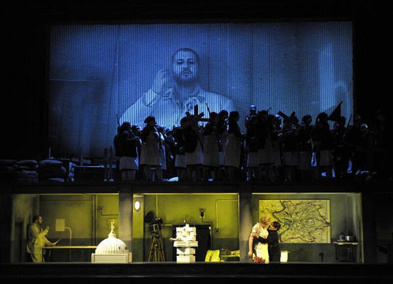 But since "Rienzi," adapted by Wagner from a best-selling novel by Sir Edward Bulwer-Lytton, is rarely staged and is far from a masterpiece, it's hard to fault Stoelzl for taking a daring approach. And some of it is undeniably clever. The overture, the most familiar part of the score, borrows a page from Charlie Chaplin's "The Great Dictator" to show a young Rienzi (who looks more like Mussolini than Hitler) dreaming at his desk. The actor playing the role becomes inspired by the music, first waving his hand as if to conduct, then running around the stage turning somersaults and cartwheels in his exuberance, and finally imagining flying high above the globe to dominate the world.