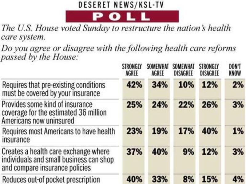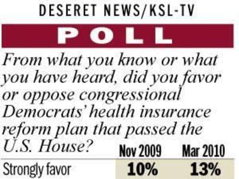 A KSL/Deseret News statewide survey taken Monday night shows that 67 percent of Utahns either somewhat oppose or strongly oppose the congressional Democrats' health insurance reform plan that passed the U.S. House on Sunday.