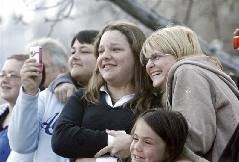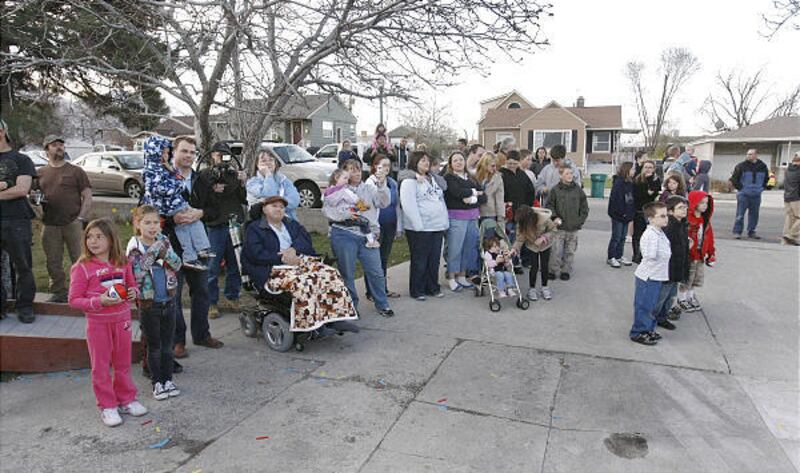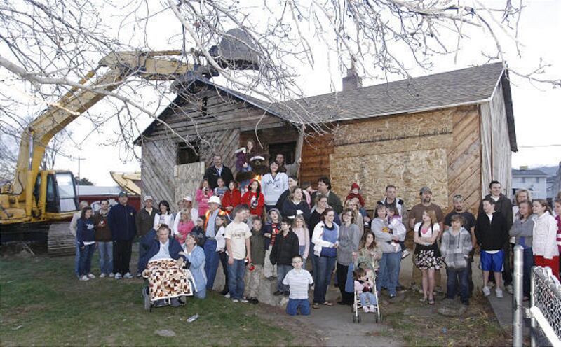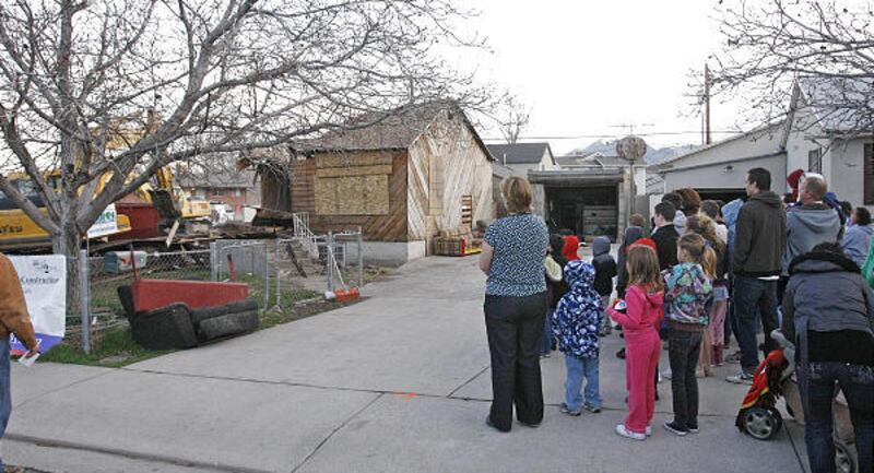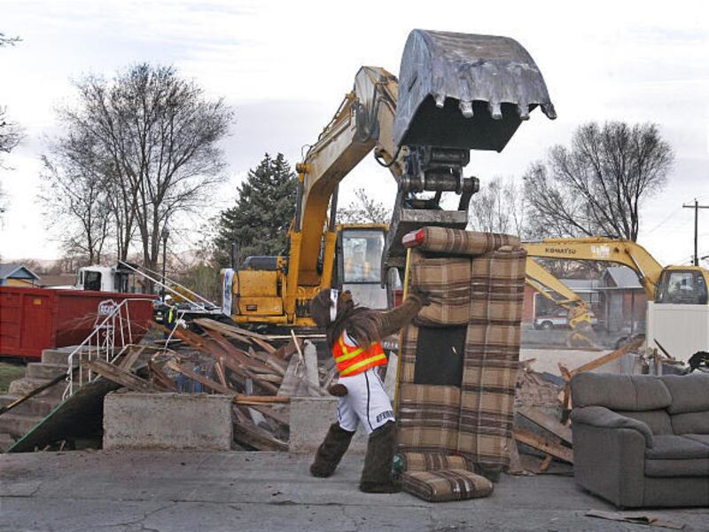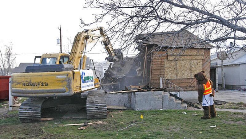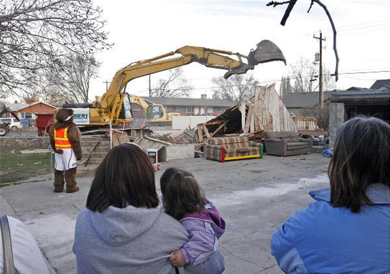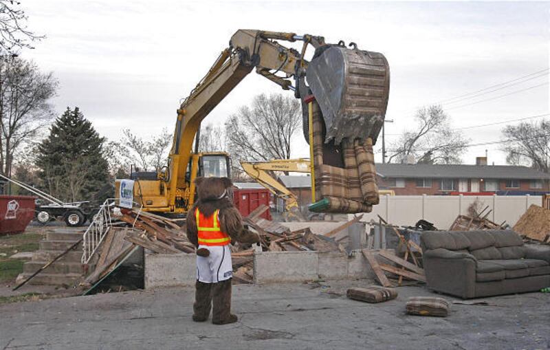 Monday, Eric and his family, joined by dozens of neighbors and volunteers, cheered as Jazz Bear climbed behind the controls of a backhoe to knock down the walls of the central Orem house the Kuesters called home until it was damaged in an electrical fire on Dec. 16.